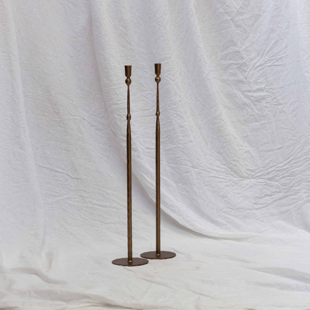 Hand-forged with delicate balance and intention, its long taper and subtle detailing draw the eye upward, creating height and warmth wherever placed. Whether standing solo beside a fireplace, flanking an entryway or used to anchor a moody dining setting, it adds a sculptural layer that feels grounded and refined.