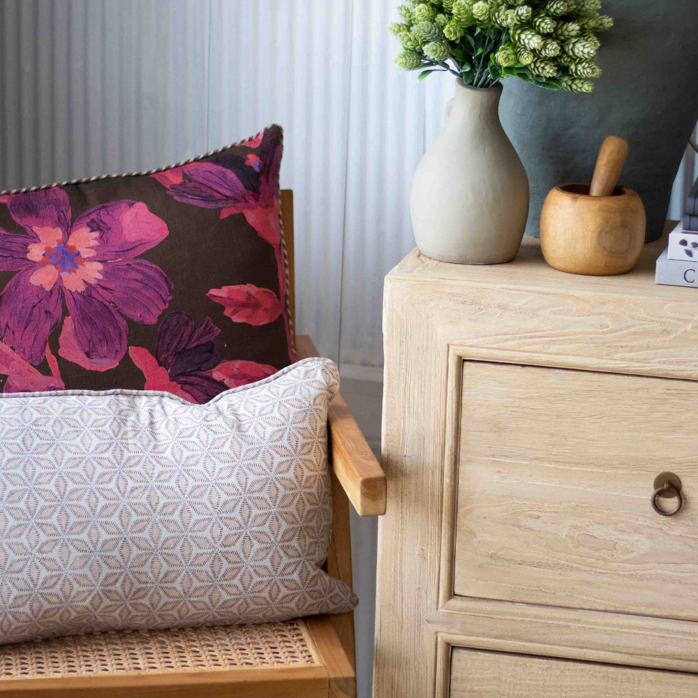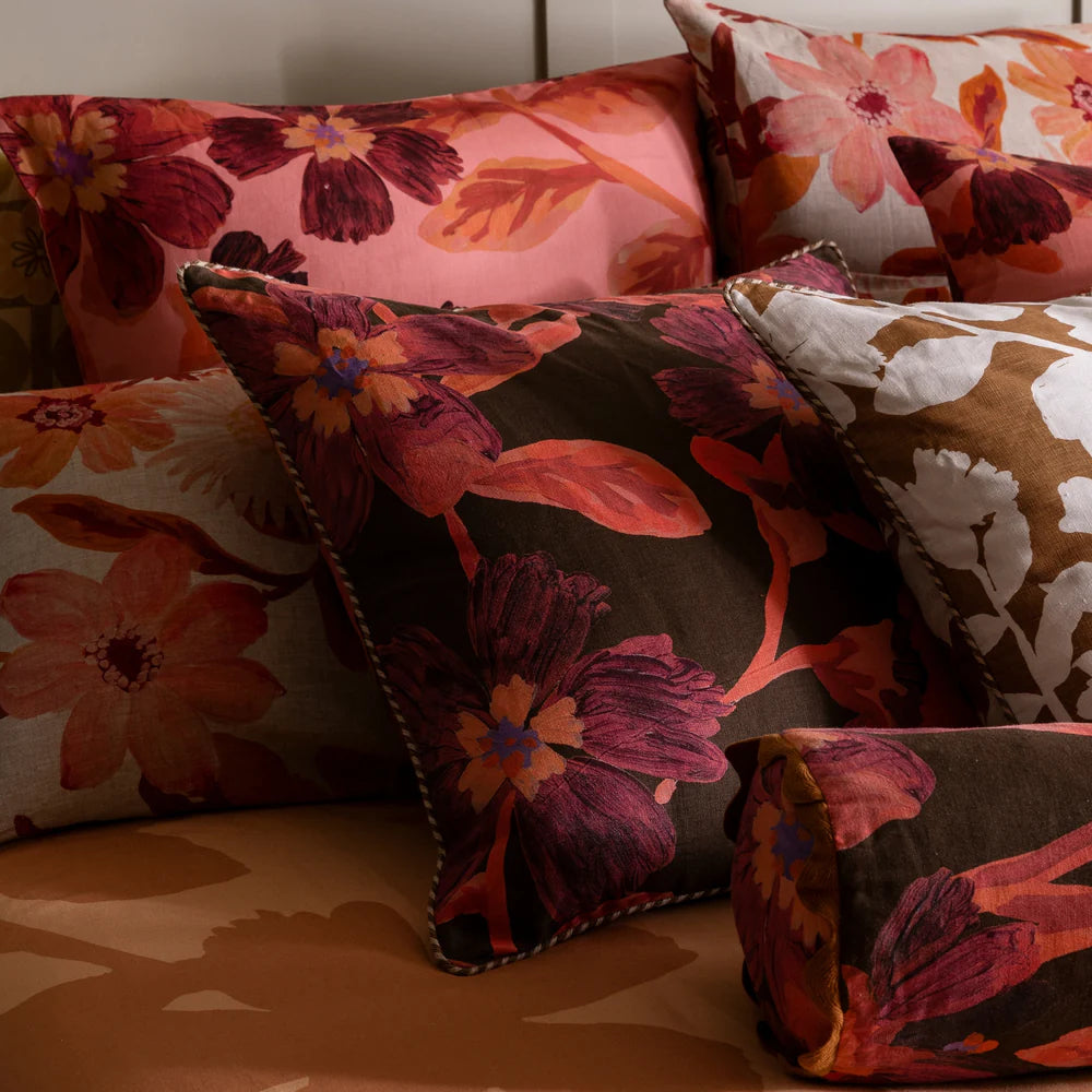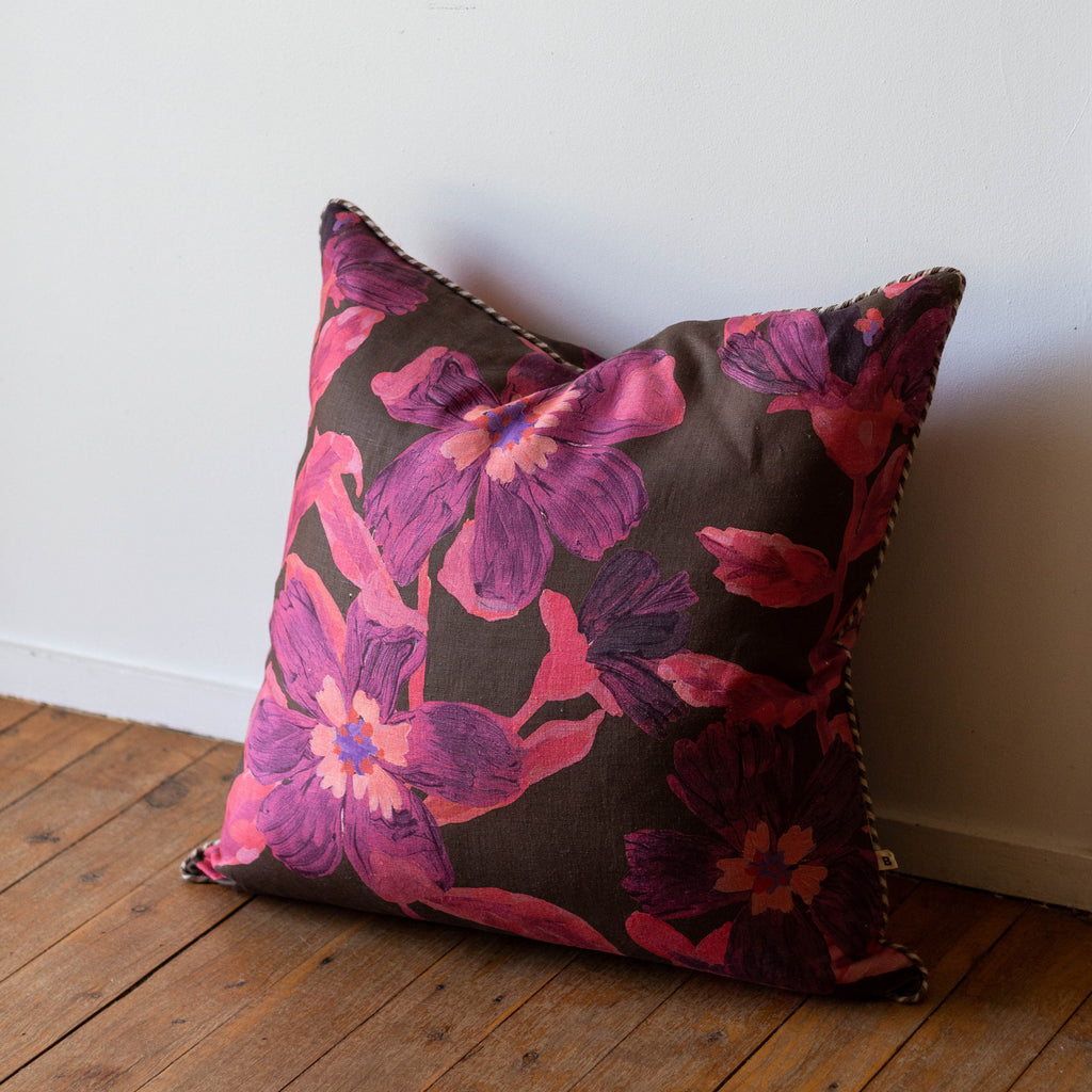 Our Cosmos Cerise 60cm cushion features original artwork by Bonnie printed on white linen. The reverse of the cushion features the same design. Our cushions have the most impact when styled together using complementary designs, trims and colours.