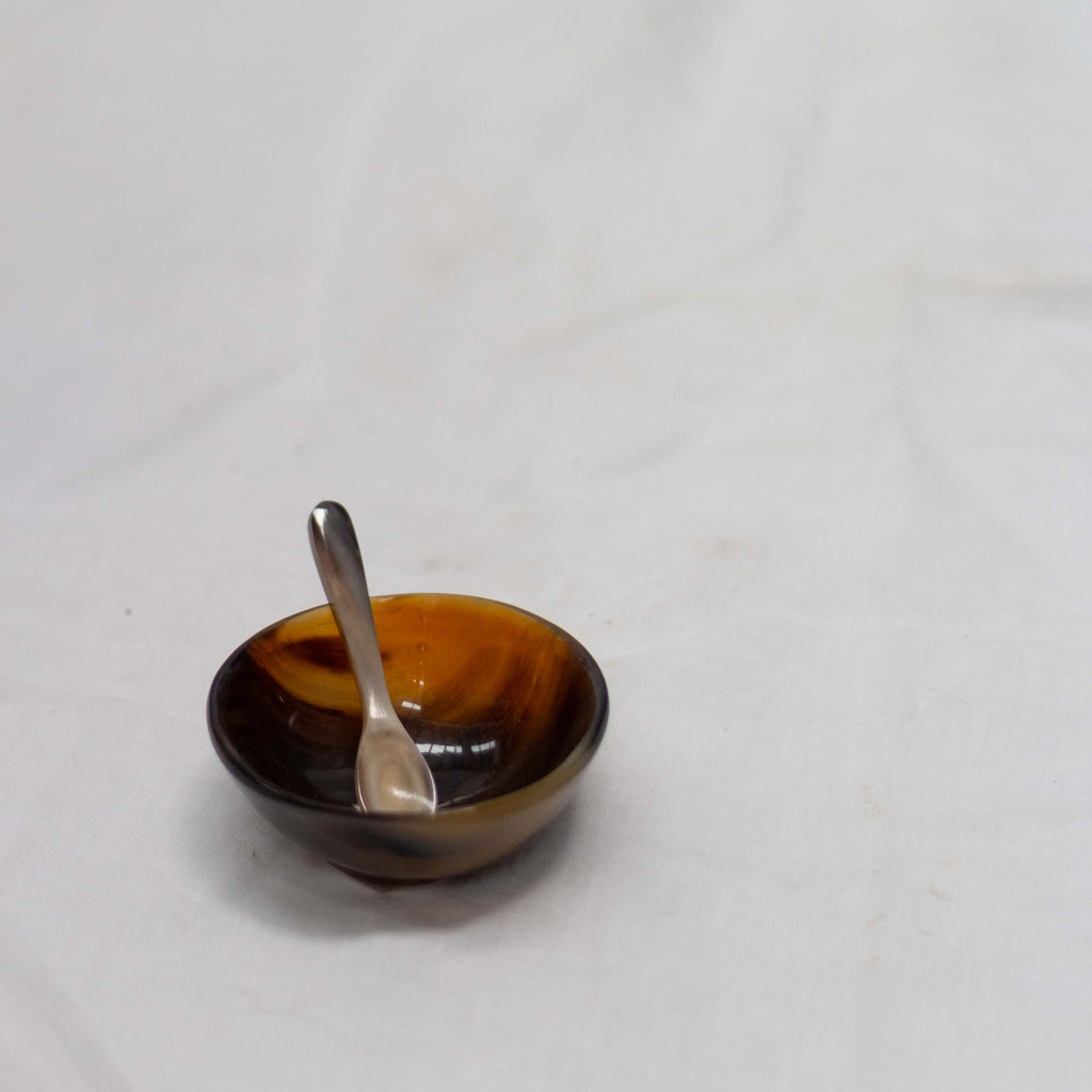 The Natural Horn Salt & Pepper Bowl with Spoons is a refined addition to the dining table, blending practicality with artisanal beauty. Each bowl is hand-carved from natural horn, giving it a smooth polished surface and rich variation in tone, from deep blacks to warm ambers and creamy highlights. No two pieces are alike, making every set a unique treasure.