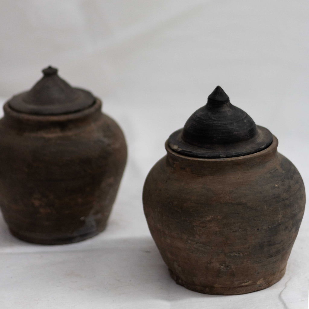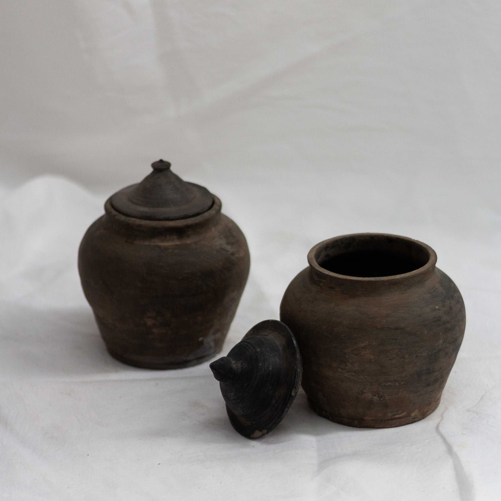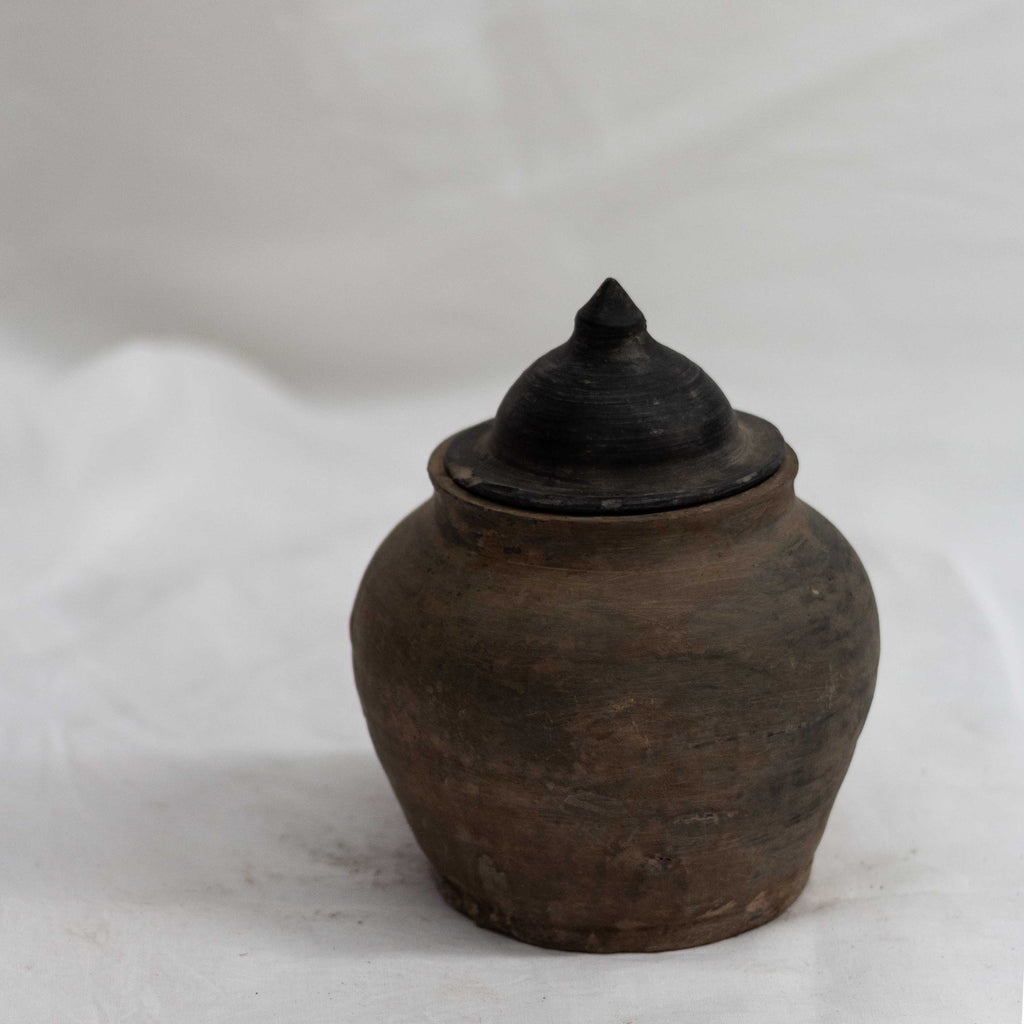 The unglazed body and darkened lidded top speak to years of use and fire exposure, giving each piece a distinctive patina and organic warmth. With its softly rounded belly and hand-thrown character, it brings a sense of authenticity and soul to any space it inhabits.