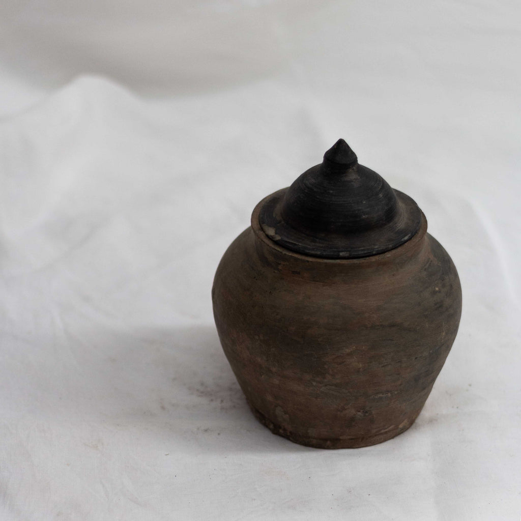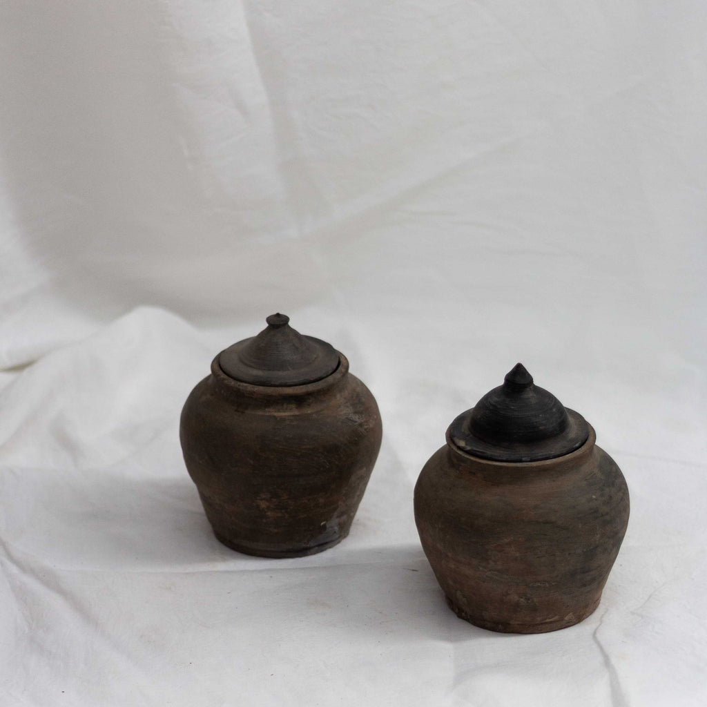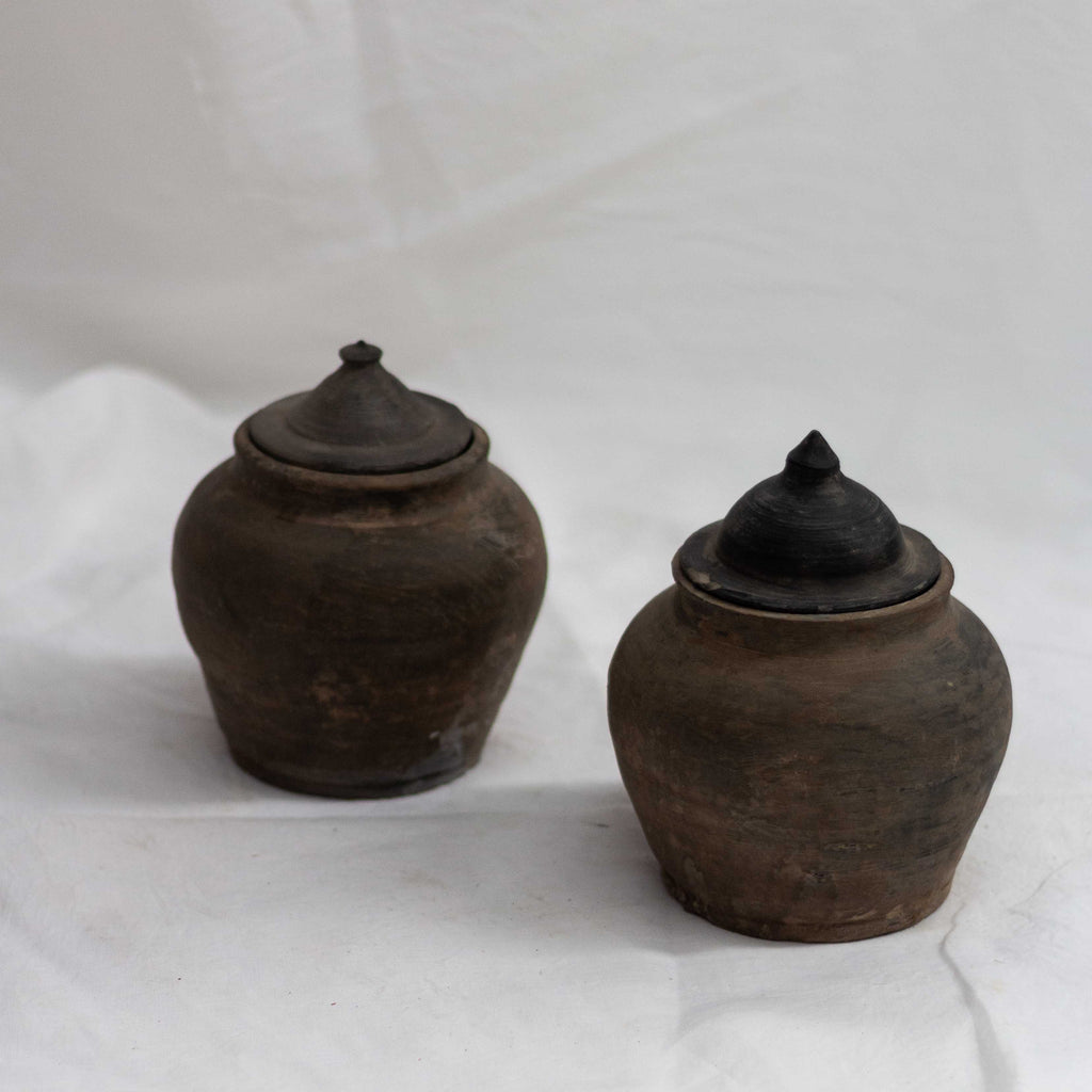 The unglazed body and darkened lidded top speak to years of use and fire exposure, giving each piece a distinctive patina and organic warmth. With its softly rounded belly and hand-thrown character, it brings a sense of authenticity and soul to any space it inhabits.