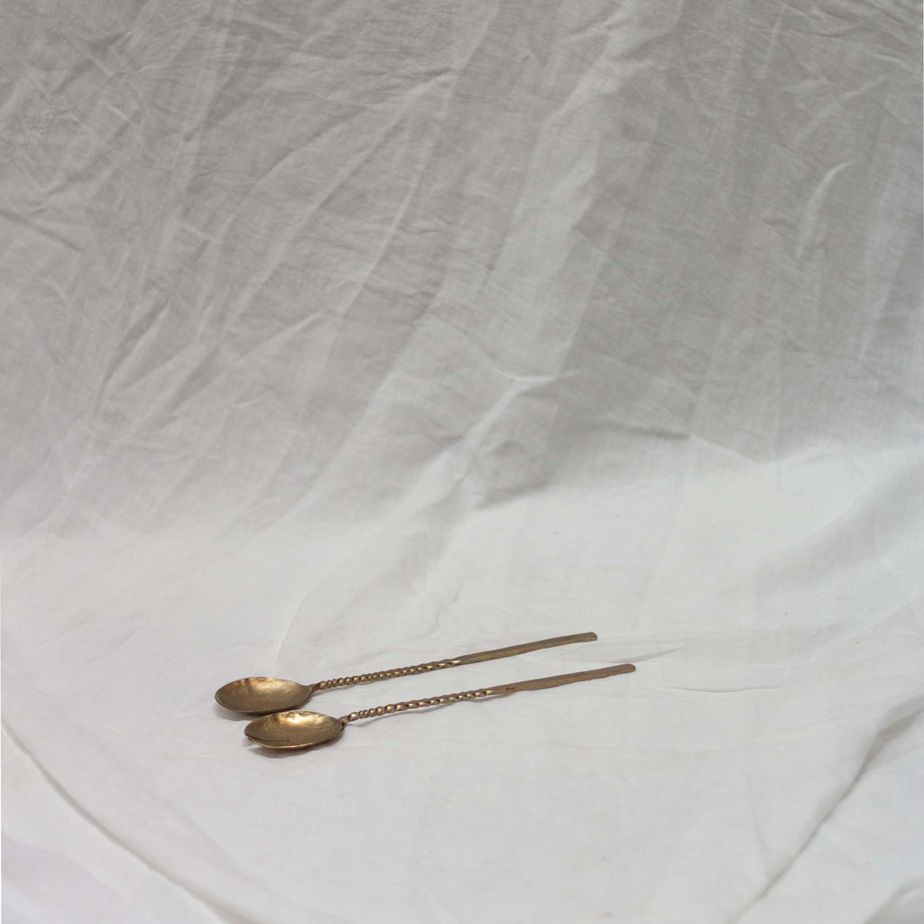 Each set is forged from solid brass with a rich antique patina that deepens over time. The serving spoon and fork are perfectly balanced in size and shape, making them ideal for tossing leafy greens or dishing up a heartier side. Their handcrafted nature ensures that no two are exactly alike, which adds to their quiet charm.