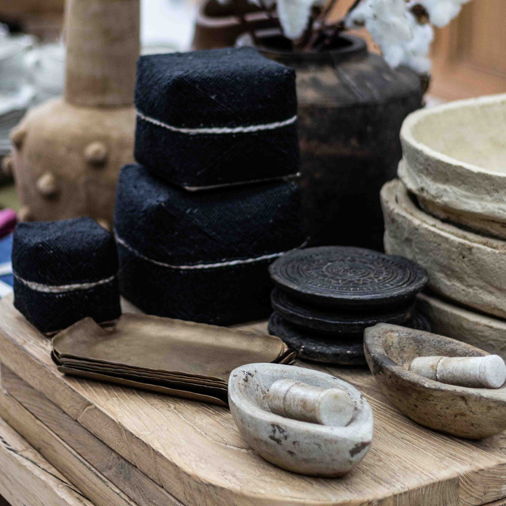 Our Old Marble Kharal with Pestle is a beautiful antique Indian ceremonial piece hand carved in marble. It would make a lovely display piece, and add a rustic charm to your space. This piece is stylish yet functional, and can be used for its original purpose in your kitchen.