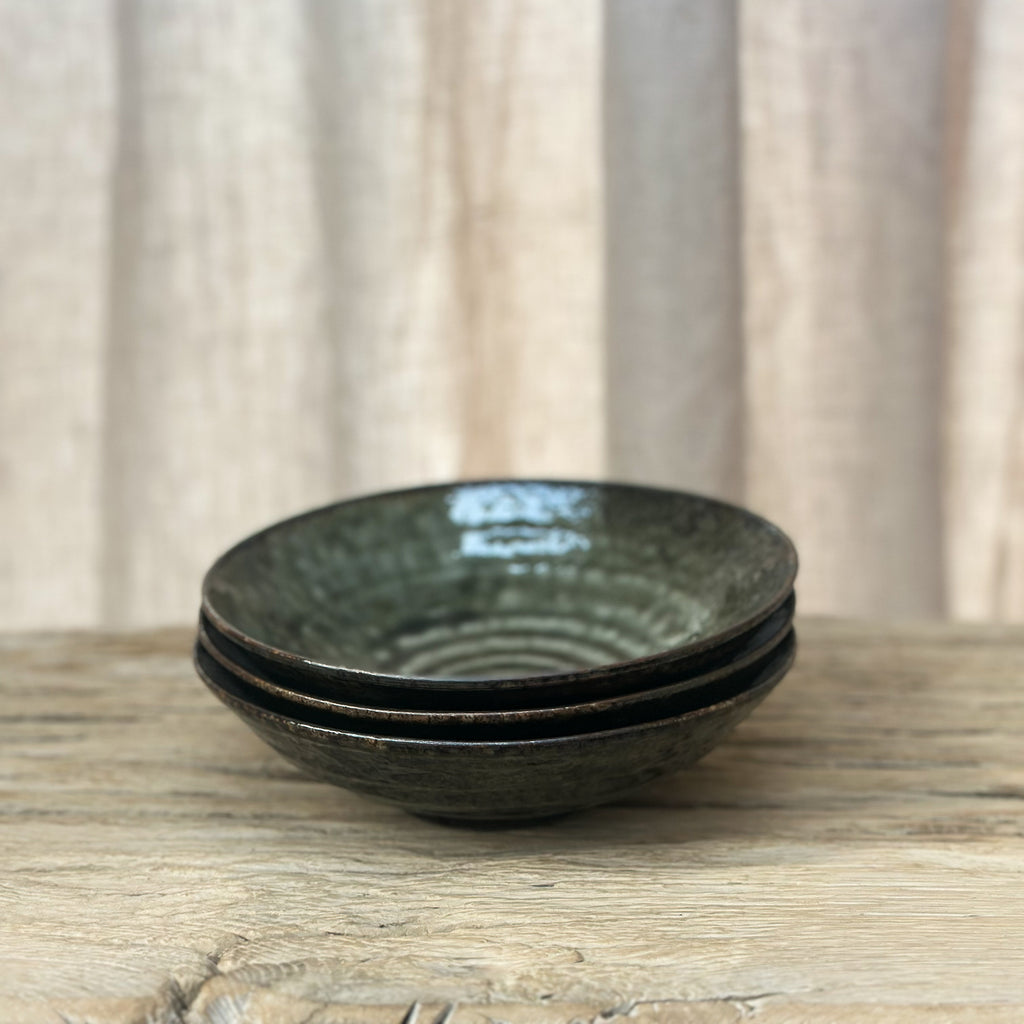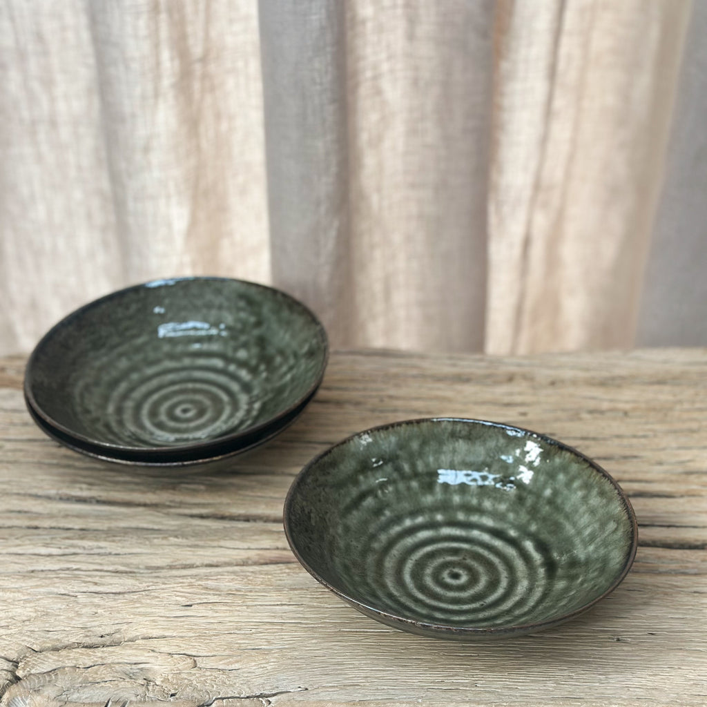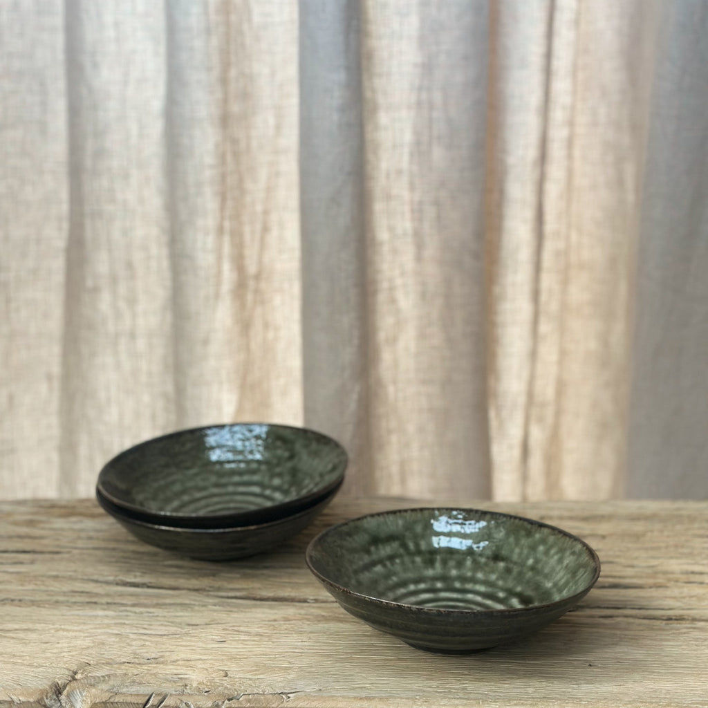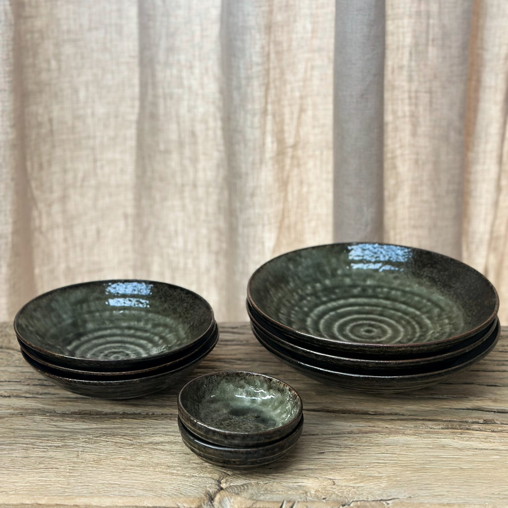 The serene hunter green glaze offering a subtle yet striking complement to any table setting. Each platter boasts delicate variations in tone and texture, making every piece uniquely yours.