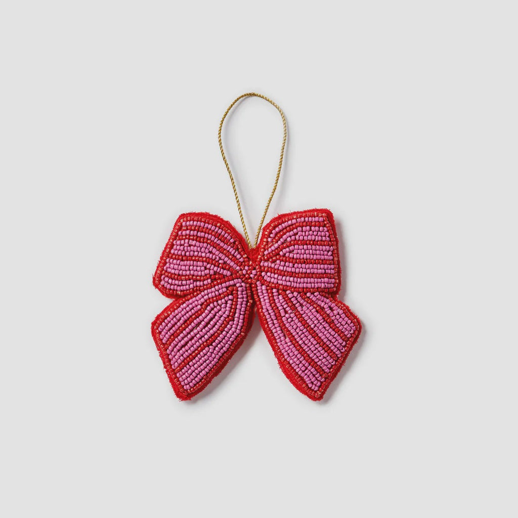 Symbolising the joy of giving, this hand-beaded Bow Christmas Decoration in vibrant pink and red adds a playful, festive touch to your Christmas tree.