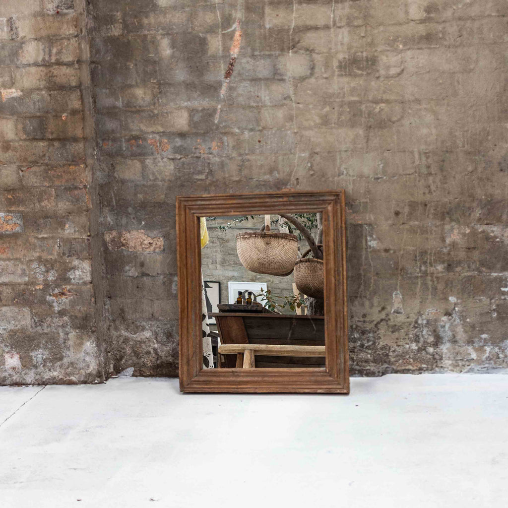 Add a story to your space with this authentic vintage mirror, unearthed in the bustling blue city of Jodhpur, India. Handcrafted from solid aged teak, its rich, warm tones and naturally weathered patina tell tales of Rajasthan’s storied past.