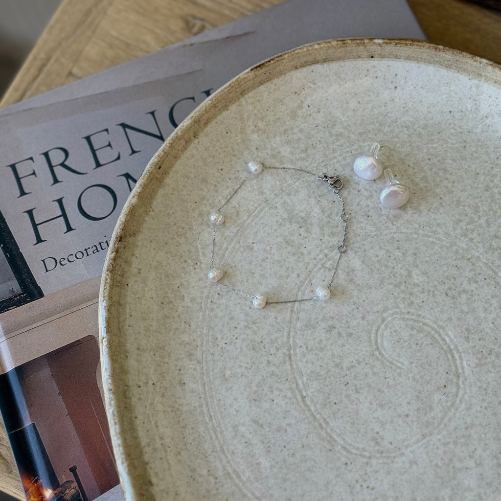 Our KEIR Grace Freshwater Bracelet is a fine chain, with small freshwater pearls, available in Gold or Silver. It looks great layered or sits perfectly alone.