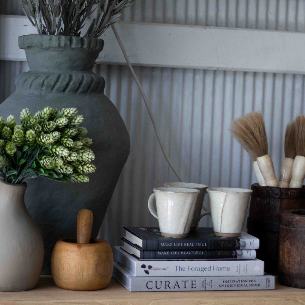 The distinctive pinch handle design adds a sculptural quality, making it as beautiful on its own as it is when styled with dried flowers or delicate greenery. Its neutral stone tone complements any colour palette, allowing it to blend seamlessly into coastal, bohemian, or contemporary spaces.
