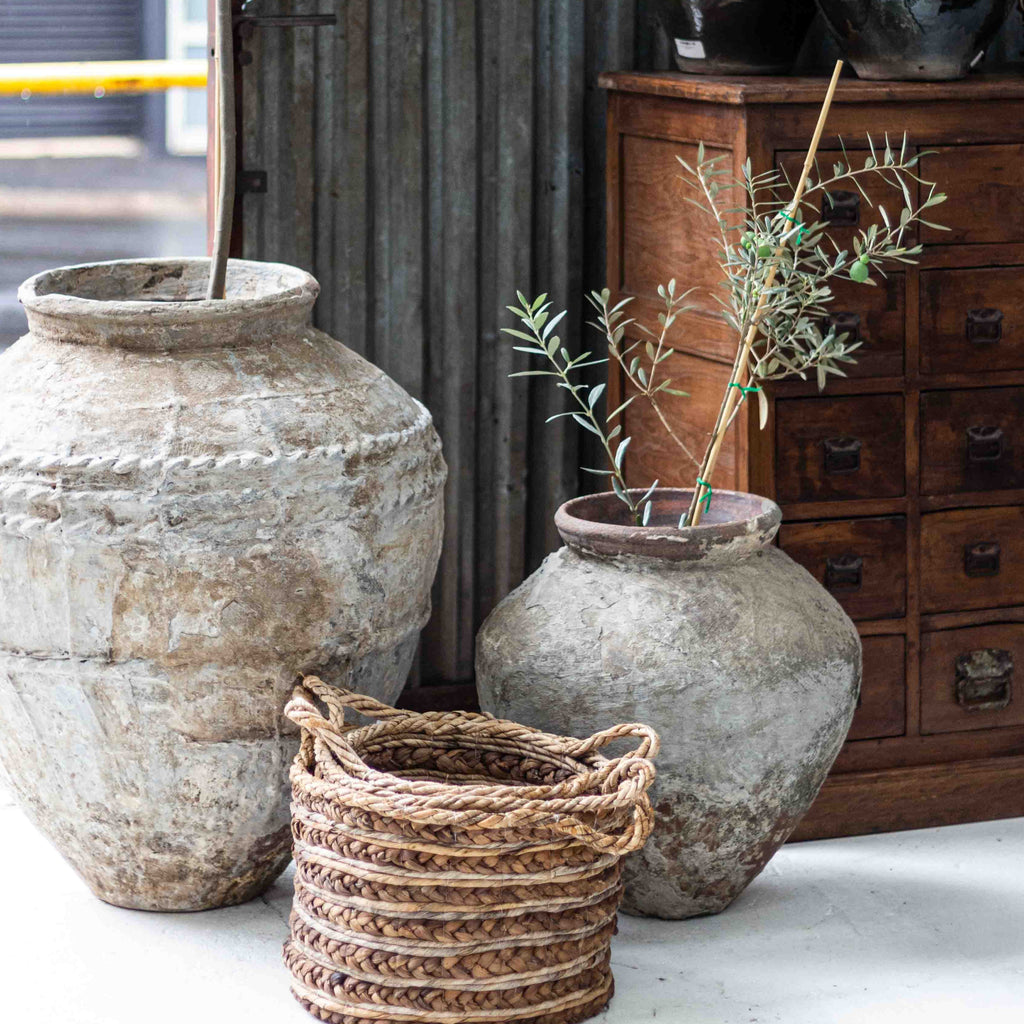 Our Borneo Earth Pot is traditionally used as an old water carrying vessel from Borneo, and was used to store water in the villa or home. Made of CRC with a rustic grey finish, this piece with it's lovely cool colour & texture would make a great addition to a bookcase, foyer or bench.