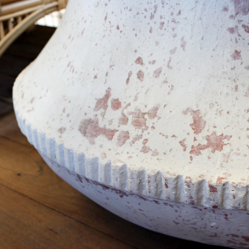 Our Washed Large Bell Pot will give a big statement. The pot has a white washed surface over a rust coloured cement/terracotta mix material. It will give an interesting and beautiful contrast to your chosen plant.