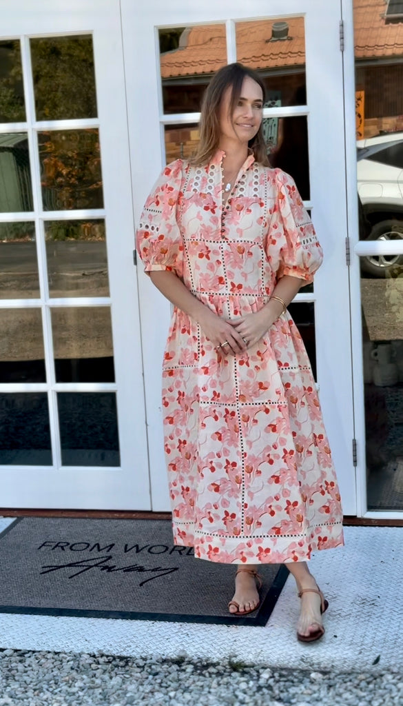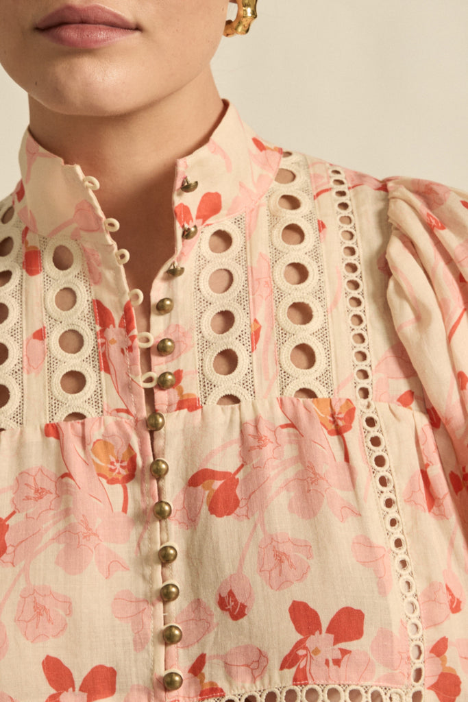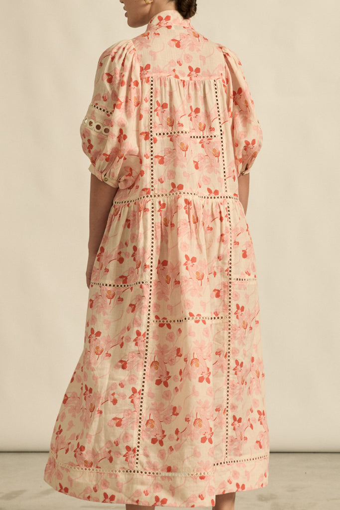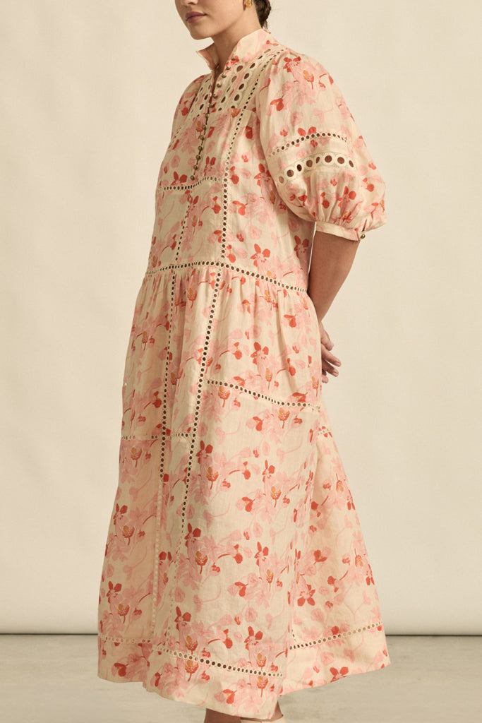 ornate detailing and a relaxed silhouette define the impel dress. with circular lace trims and vintage brass buttons, this piece balances presence with polish.
