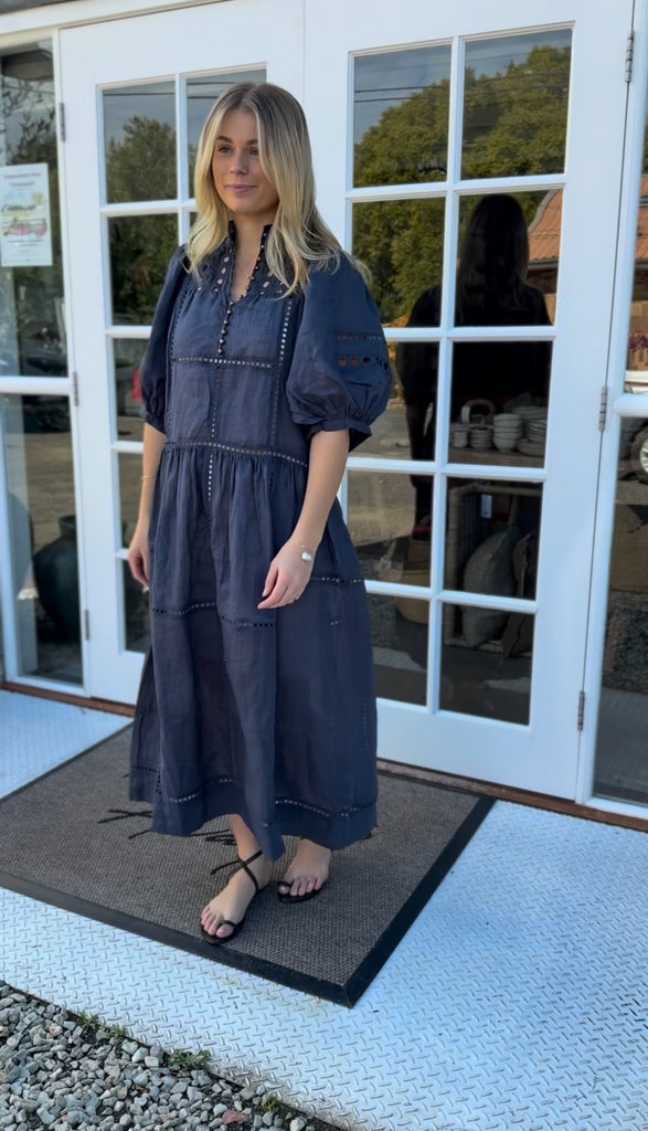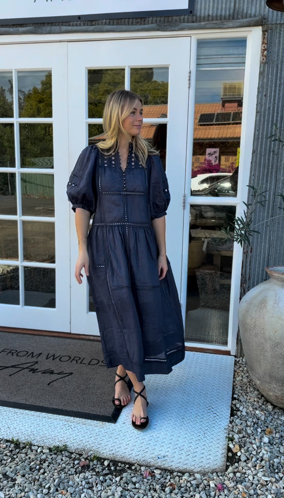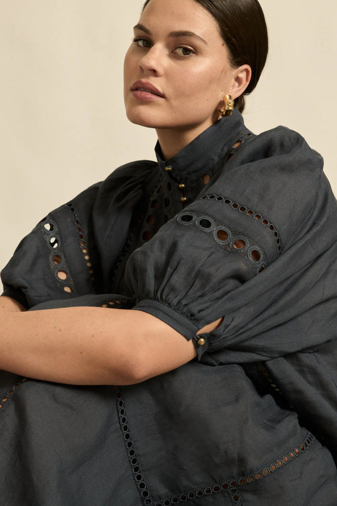 ornate detailing and a relaxed silhouette define the impel dress. with circular lace trims and vintage brass buttons, this piece balances presence with polish.