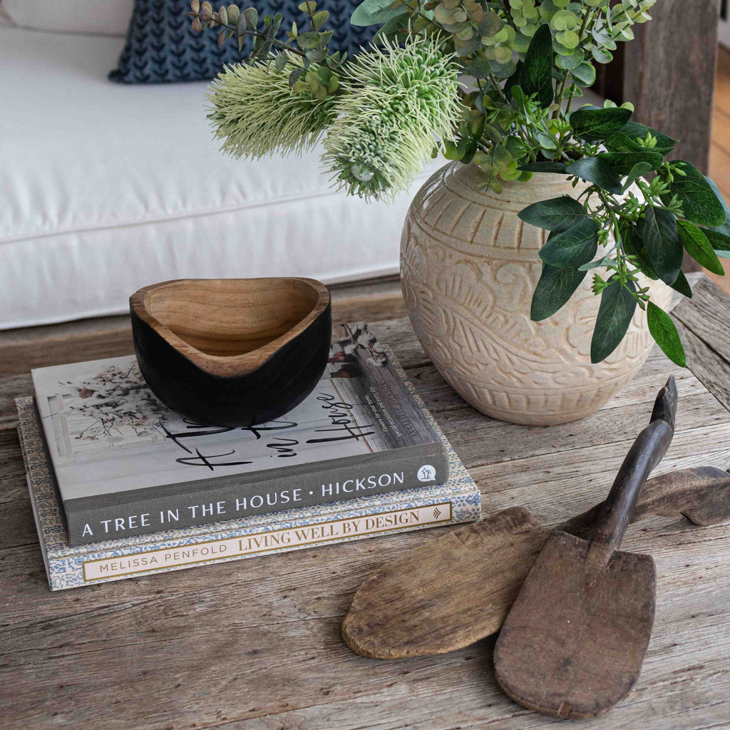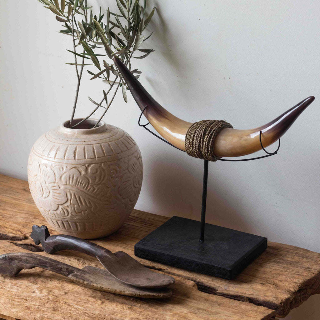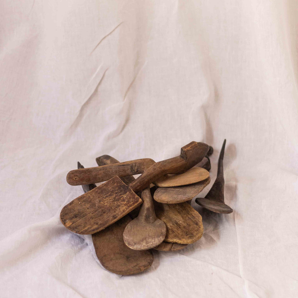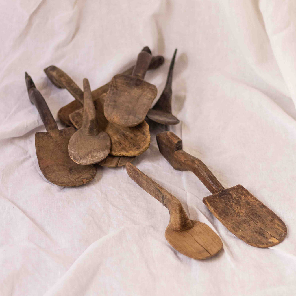 These vintage Indonesian wooden paddle spoons were formed by hand, making them entirely unique and one of a kind. Use this beautiful item in your home on shelving on their own, or in a pair resting along the length of a sideboard or console table.