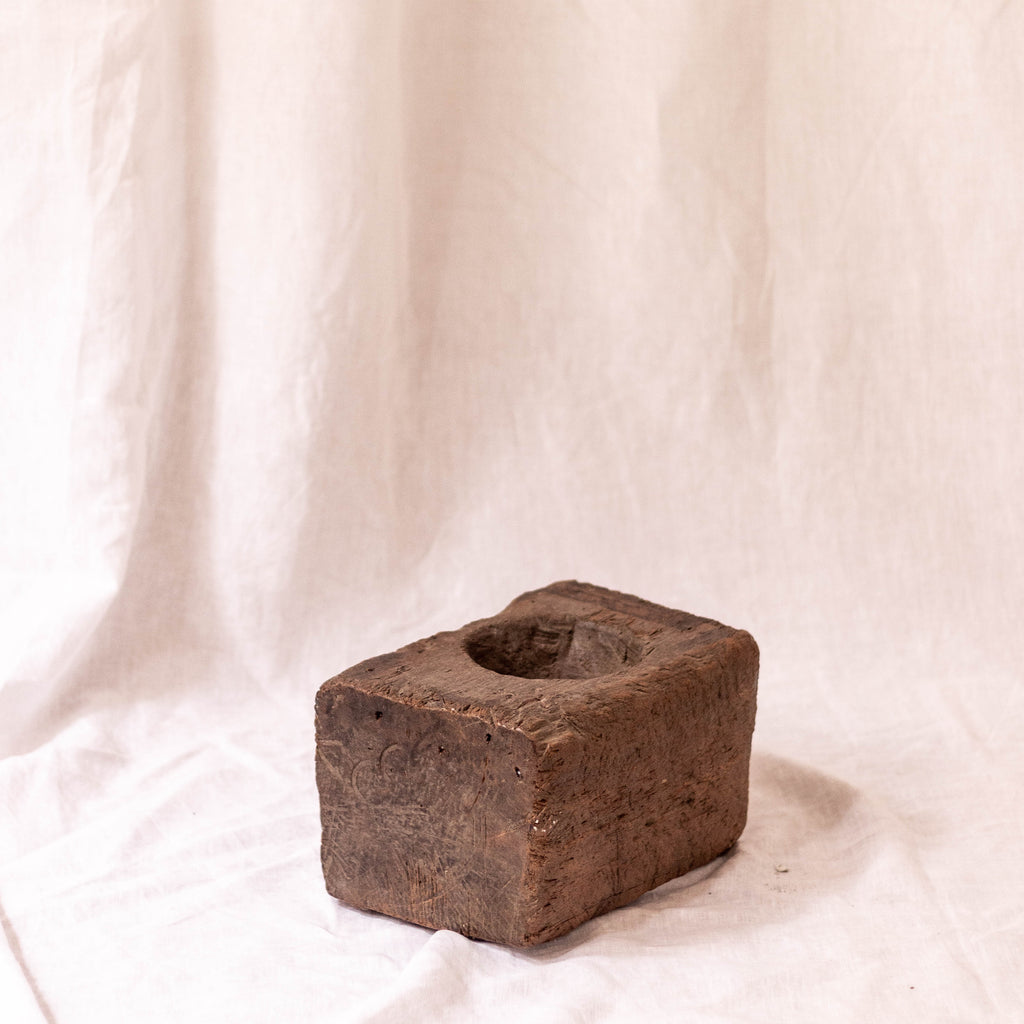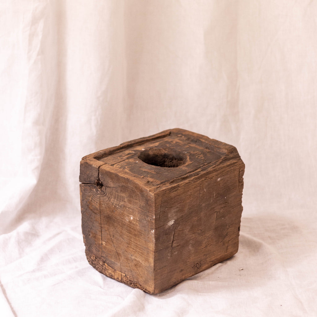 The beautiful patina and primitive look of our vintage wooden grinders block will add a beautiful touch to your home. Originally used to grind down different foods and grains. These pieces are perfect on their own or place a tea light candle inside (ensure any candle placed in the hole is within another vessel when burning)
